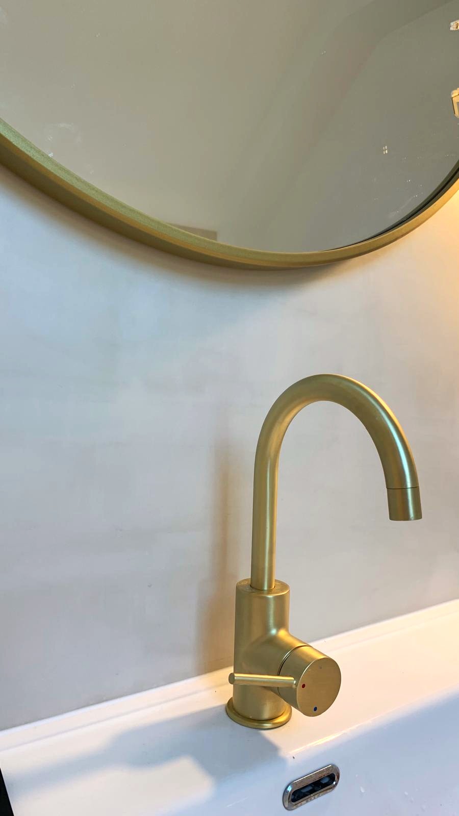 Les robinetteries finition laiton brossé et le meuble vasque suspendu en bois viennent souligner l’élégance sobre de l’ensemble.