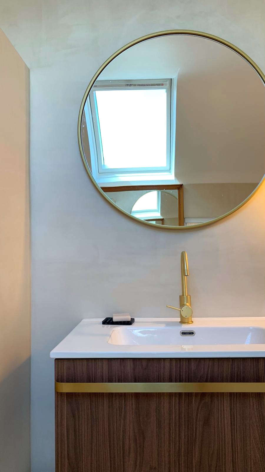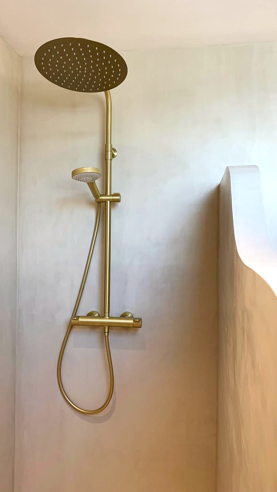 La salle d’eau a été réalisée en enduit tadelakt, finition minérale continue, idéale pour les pièces humides.