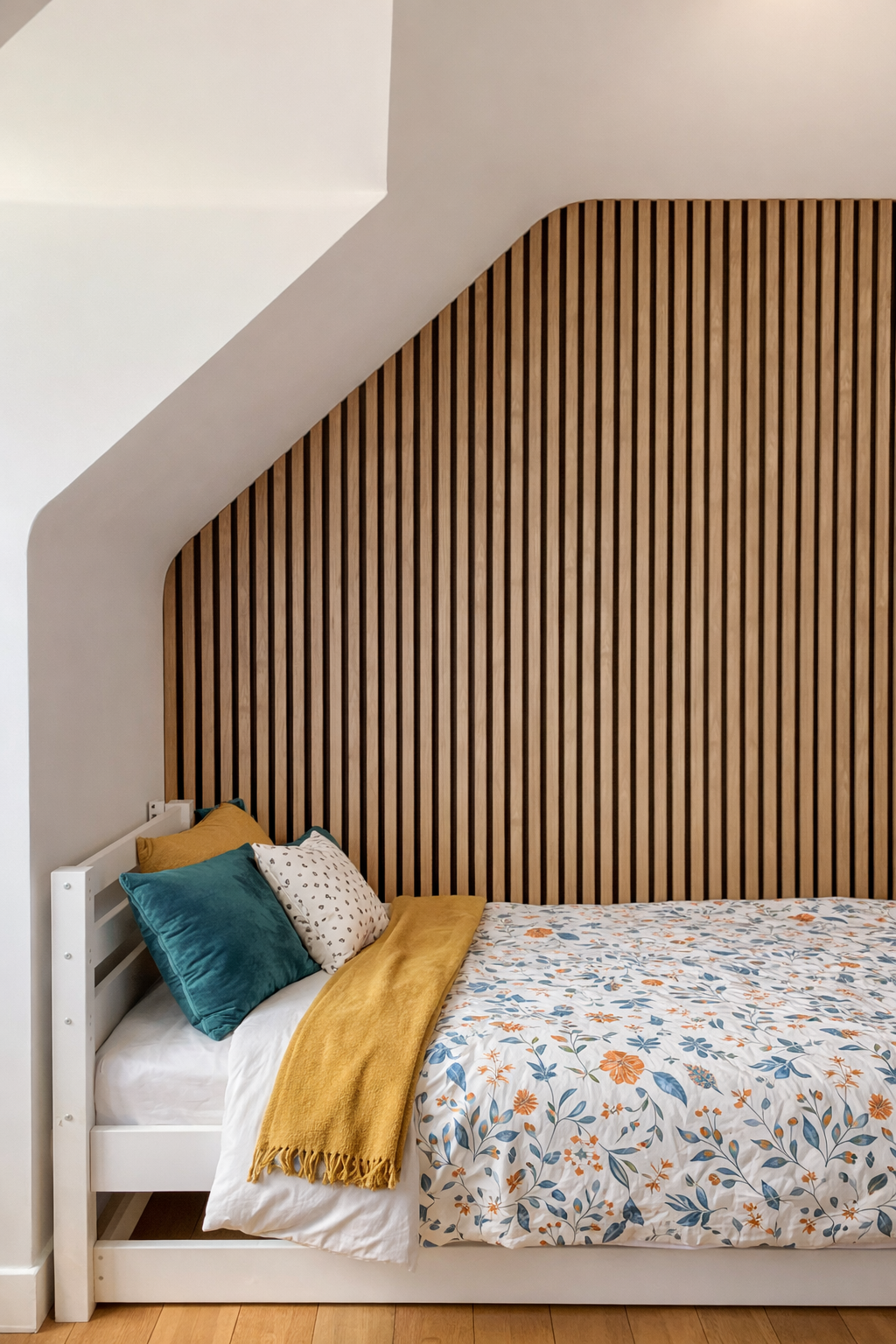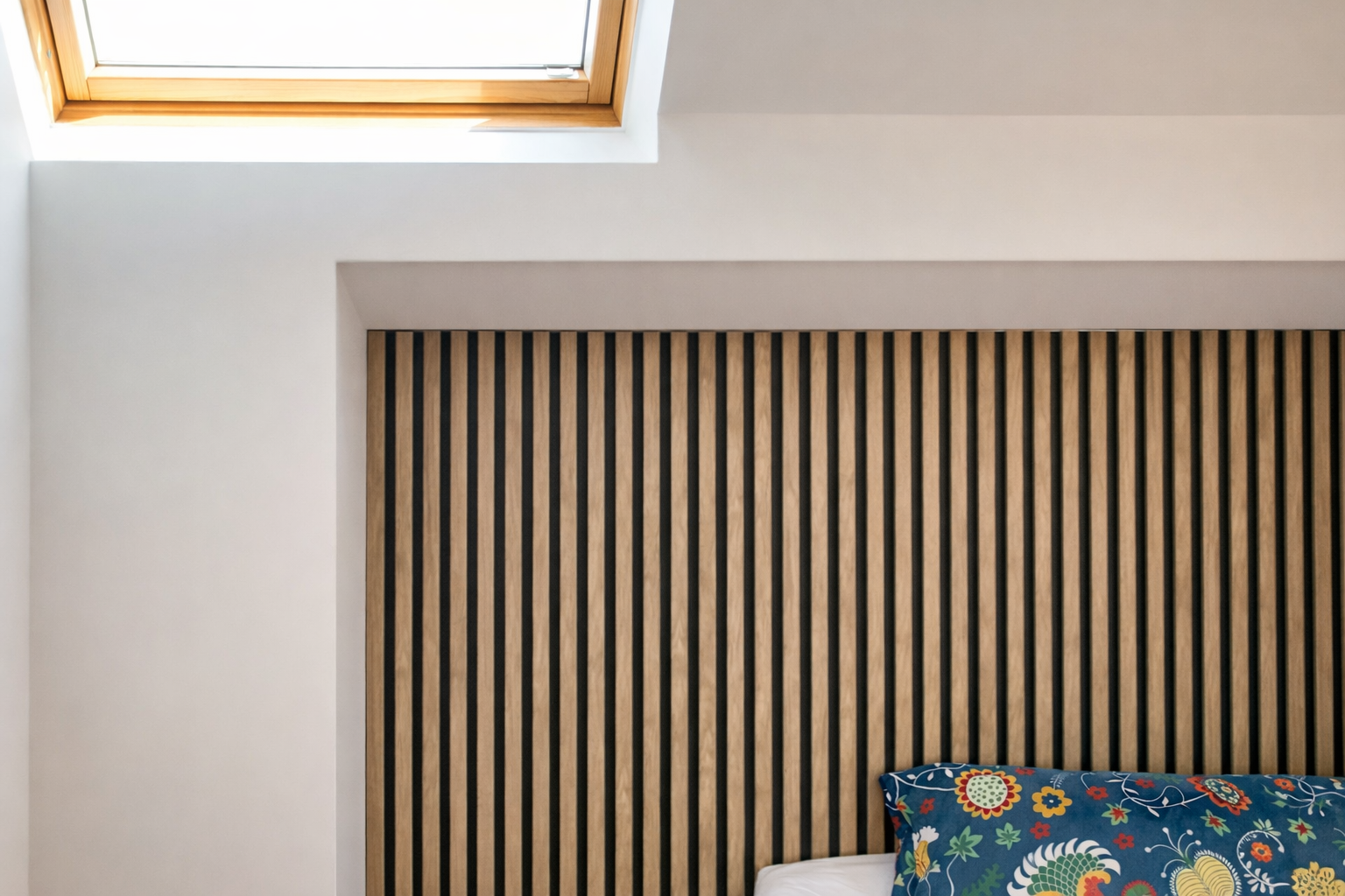 Pour améliorer l’acoustique tout en structurant visuellement l’espace, un habillage mural en tasseaux bois acoustiques a été installé en tête de lit.