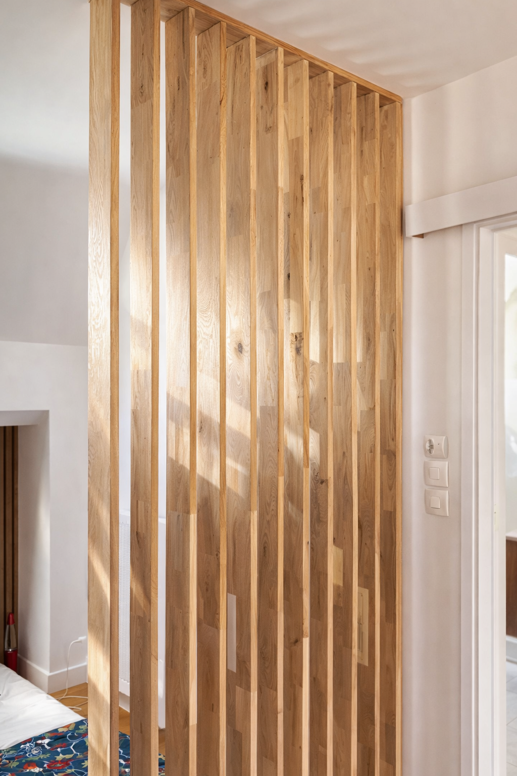 Un claustra en bois sur mesure vient rythmer l’étage et créer une séparation légère entre les espaces.